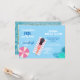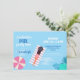 These modern, graduation pool party invitations are sure to get the summer party going!  Text templates on front and a photo template on back.  Tropical palm trees at lower right, beach ball on lower left, with a brunette floating on a striped pool float in a pool.