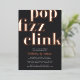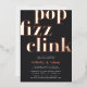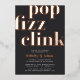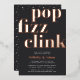 Modern and minimalist engagement party invitations feature chic black and white styling with "pop fizz clink" in oversized rose gold foil retro lettering. Personalise with your engagement celebration details beneath. Invitations reverse to a pattern of colourful stars.