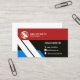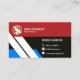 This business card has a display of strong bold colours. At the top of the card sits a dark red rectangle, the focal point of the card, here sits your name and position. An area of authority. Beside your name is the business logo. Two white diagonal columns slant below, to bring contrast to the dark colours. In the black column is the Business name and contact details. All the alphabets are done in white, to showcase the sharp contrast. The blue rectangular at the bottom left corner holds up the slanting rectangles for colour support. This is a bold card design for bold people. Sharp, elegant and concise in features. An eye catching piece of work, design is suitable for those in sales and marketing.