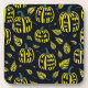 This design shows a modern variation of a pattern of yellow-green pumpkin sketches on a dark background. The design is based on an image done with the use of a AI image creator.