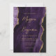 This elegant wedding invitation features a background image of purple watercolor agate trimmed with faux gold glitter. The customisable text combines chic gold-coloured modern handwriting, copperplate and italic fonts. The reverse side provides space for wedding details on a matching purple agate background, along with a QR code guests can scan to visit your website and RSVP, which saves the cost of printing and mailing separate RSVP cards.