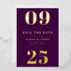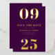 Modern save the date featuring your numeric wedding date in bold gold foil lettering with a dark purple background. Personalise the dark purple and gold foil save the date card by adding your names, wedding date, and wedding location.