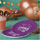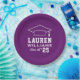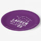 Custom round graduation paper plates features a purple and white design (can be modified via "Customise It!") with a graduation cap and custom text for the grad's name and class year.