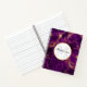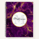 Personalised notebook with a beautiful abstract pattern featuring a marble design. Rich purple colours blending together combined with faux-gold swirling ribbons of colour mixing and mingling throughout the design. A circle with a faux gold-foil border layered over top with your personalised text inside.