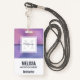 Name badge with a modern stylish background. Pink and purple colours swirling around creating an elegant gradient effect.