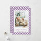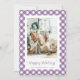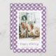 Custom purple plaid photo holiday card featuring a purple and white chequered pattern and a modern script font. Easily personalise this gingham check photo holiday card with your photo and the family name.