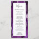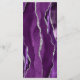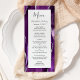 This elegant, modern wedding menu features a watercolor purple agate background trimmed with silver faux glitter. The text appears in elegant charcoal grey handwriting and copperplate fonts on a white rectangle. The agate design is repeated on the reverse.