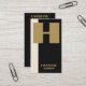 A modern and professional business card using black, gold, and ivory for a man or woman. Your initial on the front is to be personalised with your full name or business name. On the back is a QR code to add a "call to action." Also your name, title, address, phone, email, website, and social media information. Minimalist and professional to represent your brand or business. Fully editable-change the background and text colour to reflect your branding.
