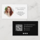 This design features a modern QR code social media business card template, with a trendy professional photo logo template, with Instagram Facebook, and other social media, with website minimalist minimal simple, trendy black and white, an elegant stylish chic scannable code, email web address phone mobile, watercolor brush edge effect, simple business card photography, with a scan scannable QR code generate