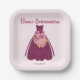 Modern Quinceañera paper party plate features floral and glitter ballgown on pale pink background.