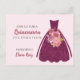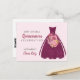Modern Quinceañera party invitation postcard features floral and glitter ballgown on pale pink background. Customise details including QR code