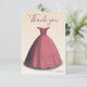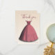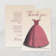 This modern quinceañera thank you card features a beautiful red dress on a beige background.