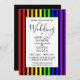 custom wedding invitations: featuring a rainbow stripe patterned border. This eye catching yet classy wedding invite makes an excellent addition to a ritzy uptown style wedding collection. Custom text includes names, date & time, location, and contact info. Background colour is also changeable should you desire a little extra kick.
