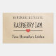 Modern "homemade with love" sticker featuring "raspberry jam" with a black font on a rustic cardboard background embellished by a cute heart. Customise text.