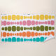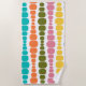 This beach towel has a mid-century modern design of vertical lines of rounded rectangles in increasing and decreasing size in retro colours of red, green, blue, yellow, orange, and brown on a field of white.