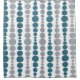 This shower curtain has a mid-century modern design of teal and grey rounded rectangles in increasing and decreasing size running vertically on a field of white.