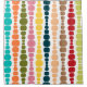 This shower curtain has a mid-century modern design of vertical lines of rounded rectangles in increasing and decreasing size in retro colors of red, green, blue, yellow, orange, and brown on a field of white.