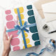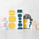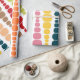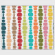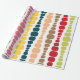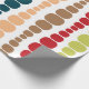 This wrapping paper has a mid-century modern design of vertical lines of rounded rectangles in increasing and decreasing size in retro colours of red, green, blue, yellow, orange, and brown on a field of white.