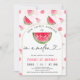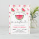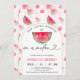 Sweet watermelon or melon theme first birthday invitation for baby girl featuring a watermelon slice, white arch, modern calligraphy text and watermelon pattern. This one in a melon first birthday invitation is ideal for someone looking for a modern summer or melon themed first birthday invitation.