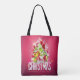 A tote bag with a bright and festive Christmas graphic design. The text says Merry Christmas & Happy New Year. Designed with a tree shaped mound of presents with festive snowflakes, stars, christmas baubles and glowy looking sparkles. Pine tree needles and tree shaped illustration also included in this holiday image. The background is a vibrant reddish pink colour.