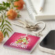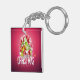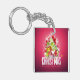 Keychains with a bright and festive Christmas graphic design. The text says Merry Christmas & Happy New Year. Designed with a tree shaped mound of presents with festive snowflakes, stars, christmas baubles and glowy looking sparkles. Pine tree needles and tree shaped illustration also included in this holiday image. The background is a vibrant reddish pink colour.