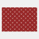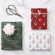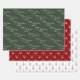 This set of three Christmas wrapping paper sheets offers a festive variety of designs, perfect for adding a personal touch to your holiday gifts. One sheet features a stylish deep green background with elegant white script that reads "Merry Christmas" along with a customisable family name, adding a classic, personalised element. The second sheet showcases a bold red background adorned with a pattern of white reindeer antlers, creating a rustic, winter-inspired look. The third sheet presents a charming design of minimalist Christmas trees in red and green, set against a crisp white backdrop, ideal for a modern, cheerful wrapping theme. This versatile set is perfect for wrapping gifts with a cohesive yet diverse holiday style.