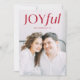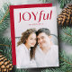 Simple holiday photo card "Joyful" displayed in red modern lettering. Personalise the modern holiday card by adding your vertical photo, family name, and the year. The card reverses to display subtle white dots on a red background.