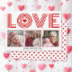 Modern red LOVE and heart photo Valentines Day card. It features the word "LOVE" in a modern striped font in red and three photos. The backside features a pattern of red hearts. One photo is curtesy of Photography © Storytree Studios, Stanford, CA