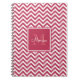 Personalised spiral notebook features a trendy chevron pattern in Viva Magenta (crimson red) with custom name in white handwriting and monogram in coral.