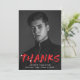 Stylish, modern graduation thank you card featuring the graduate's vertical photo with "Thanks" in red lettering with white paint splatters. Personalise the front of the creative thank you card by adding the graduate's name, school name, and graduation year. The back of the graduation photo thank you card features space for a typed or handwritten thank you message and a red and white paint splatter background.