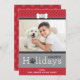 Send a smile this holiday season with a fun puppy dog-themed Christmas holiday photo greeting card, complete with dog bone and paw print design accents. Modern design with a polka dot patterned background and festive red and grey colours.