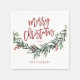 A Modern Red Script Merry Christmas Greenery Holiday Napkin featuring bold script and watercolor garland with leaves and berries.