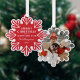 Looking for a Christmas card and ornament in one? This snowflake shaped Christmas ornament is perfect to hang on your Christmas tree. Personalise it with a photo and your name and the year. The traditional greeting, Merry Christmas and a happy new year, is printed in white against a red background inside a modern ornate frame fitting the snowflake shape.