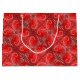Stylish and festive red holiday large gift bag. Colourful pattern of swirling snowflakes and sparkling accents on a red background.