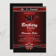 A vibrant red and black surprise 80th birthday party invitation featuring white text and a red and white ribbon and bow. Replace the details on this invitation with your own to create the perfect surprise birthday party invitation for your event.