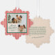 Small cream and coral red vertical stripes give this two photo Christmas ornament style card a modern and chic vibe when paired with classic fonts in forest green. The coordinated backer features a longer custom message of cheer and update for the year that is perfect for sending to friends and family.