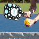 This Pickleball paddle features ombre white to blue circles on a black background like looking up and catching hints of a beautiful blue sky. Aim for the Sky! A fun and funky modern retro paddle to personalise with Initials.