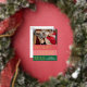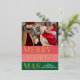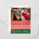 Unique, trendy and simple chic seasonal Christmas Holiday greetings card featuring your favourite winter photograph and real gold foil MERRY CHRISTMAS text on a coral red, blush pink and forest green coloured bold stripes pattern. With room to customise or personalise with a photo and family name or names of your choice on the front, and a customisable season greeting poem on the backside of the card, including your return address, city, zipcode and state.