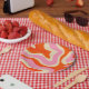 Modern Retro Liquid Swirl Colourful Abstract Pattern Square Pink Red Orange Beige. Contemporary pop 60s 90s Y2K boho aesthetic; a little bit trippy and psychedelic. By Kierkegaard Design Studio.