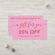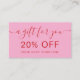 A bold pink and red discount card template designed for makeup artists, hairstylists, estheticians, and salon pros. Featuring stylish modern-retro typography and space for contact details and socials, this design is both eye-catching and practical. Front side offers a clean 20% off message, while the back includes all your business info and a deadline for the offer. Perfect for beauty professionals who want to reward returning clients or include a loyalty touch in thank you bags. Edit easily to match your tone and branding.