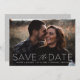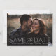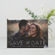 A modern save the date card displaying your favourite engagement photo with "Save the Date" in a simple white font overlay complimented by elegant calligraphy script. Personalise the front of the photo save the date card by adding your names, wedding date, and wedding location. The card reverses to a grey background with a white modern pattern. Change the colour of the background to a colour of your choice with our editing tools.