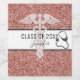 Designed with trendy pink rose gold faux glitter sparkle background and grey horizontal stripe on the centre with stethoscope silhouette on the side. Customised with graduate class year and personalised with name in white calligraphy script handwriting. Makes a great modern wine label for registered nurse, practitioner or female medical student graduation party.