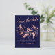 Share the big news! Send this save the date with mix between modern and vintage style with a hand painted rose gold botanical branch with leaves and flowers on an editable navy blue background. The modern typography and monogram adding a modern twist.