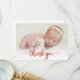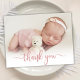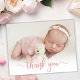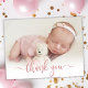 Simple Modern Elegant Calligraphy Pink Rose Gold Script Photo Newborn Baby Thank You Birth Announcement Card. Features a beautiful "thank you" text in a handwritten calligraphy swash tail font script in FAUX pink rose gold foil. Pre-made personal message at the back side. Great for baby girl or baby boy. Easy to personalise with your baby photo and details.