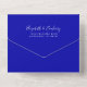 The left-hand edge of this elegant modern all-in-one wedding invitation and RSVP features a silver faux glitter border. The customisable text combines white whimsical handwriting, copperplate and italic fonts on a royal blue background. The return address appears on the outside flap and the reverse side of the detachable RSVP card in white text on solid royal blue.