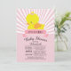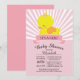 Modern bold & cute ducky Baby Shower invitation featuring a cute yellow duck for a baby girls baby shower. Our classic rubber duck invite features a sweet duck with a pink bow and contemporary banner set on a light pink & white vintage radial stripe background and has a matching back for an extra special touch. Perfect for a duck themed baby shower for a baby girl.