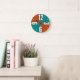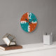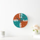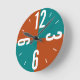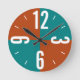 Modern rust and teal blue large numbers Round Clock. It showcases the numbers 3, 6. 9 and 12 in white in large size and white lines instead of the rest numbers on colour blocks of rust and teal.