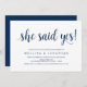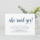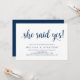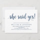 Beautiful Modern Beautiful Rustic design, in Navy Blue Script, Wedding Engagement Party Invitation card (She said YES). The perfect invitation card, for your engagement party celebration. Add your details in matching font / lettering.