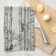 This modern kitchen towel features hand-drawn birch trees with red Cardinal birds perched on branches in black ink, with shading done in cross-hatch style, against an elegant very light sage green background.