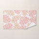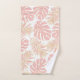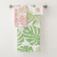 Modern sage green and pink tropical leaves Bath Towel Set. This stunning bath towel set features a contemporary combination of sage green and pink, adorned with a vibrant tropical design. The design showcases elegant monstera and palm leaves, outlined in a luxurious gold hue. The bath towel itself boasts a soothing sage green colour, while the hand towel adds a pop of playful pink. To add a personal touch, the wash cloth is customised with your monogram and a charming tropical leaf motif. This set is the perfect addition to any bathroom, bringing a touch of nature and elegance to your daily routine.